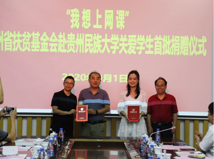 9月1日,“我想上网课”贵州省扶贫基金会赴贵州民族大学关爱学生首批捐赠仪式在我校大学城校区行政楼第七会议室举行。20名在校优秀贫困大学生每人都获得了一台价值3000余元的联想笔记本电脑。
