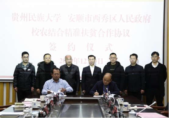 在全省上下认真贯彻落实党的十九届五中全会精神,扎实推进脱贫攻坚与乡村振兴的有效衔接之际,12月9日,贵州民族大学与安顺市西秀区人民政府校农结合精准扶贫合作协议签约仪式在大学城校区举行,以实际行动帮助西秀区巩固脱贫攻坚成果,对接乡村振兴。校党委副书记、校长王林,校党委委员、副校长熊元,安顺市西秀区区委副书记、区长陈天一,副区长刘可立出席,区农业农村局、贵州绿野芳田有限公司以及我校校办、后勤管理处主要负责人、学校各食堂负责人参加。熊元主持签约仪式。