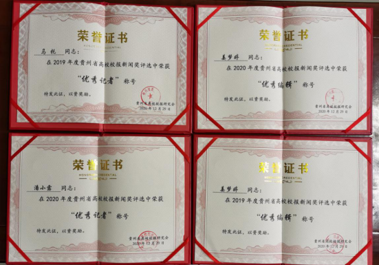 贵州民族大学2019年度参评新闻作品共12篇,获奖7篇。其中,2019年10月15日总第431期第二版、2019年3月30日总第422期第二版分别获得版面类一、二等奖;《抓好立德树人的根本任务谱写立德铸魂的时代篇章》获得言论类一等奖;《副省长魏国楠赴贵州民族大学调研指导“不忘初心、牢记使命”主题教育》获得新闻摄影类一等奖;《贵州民族大学校友张宇轩登顶珠峰,民大校旗飘扬“世界之巅”》获得消息类二等奖;《用骨髓传递生命用爱心创造奇迹》获得通讯类二等奖;《祝贺!民大校友张宇轩登顶珠峰校旗飘扬“世界之巅”》获得新媒体类二等奖。2020年度参评新闻作品共10篇,获奖7篇。其中,2020年5月15日总第441期第二版、2020年6月15日总第443期第二版两篇作品获得版面类一等奖;《省第五批援鄂医疗队队员走进民大讲述抗“疫”故事》获得消息类二等奖;《钟情彝族文化传承薪火--访贵州民族大学西南夜郎文化研究院老师王富慧》、《我记忆深处的张正东老师》分别获得通讯类二、三等奖;《校园赶大集 消费助扶贫贵州民族大学2020年校农结合消费扶贫校园展销会举行》获得新闻摄影类三等奖;《视频!贵州民族大学2020年春季学期返校复学指南》获得新媒体类二等奖。