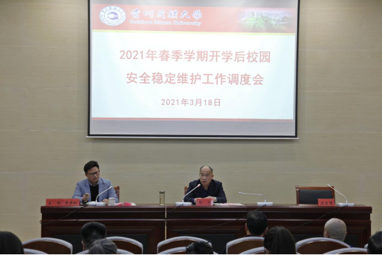 3月18日,贵州民族大学2021年春季学期开学后校园安全稳定维护工作调度会在我校大学城校区召开。校党委委员、副校长熊元出席并讲话,党办、校办、监察专员办、宣传部、学工部、校团委、保卫处、后勤处等部门负责人及各学院书记、分管学生工作副职、辅导员参会。校办主任李雪如主持会议。