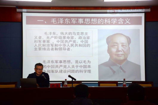 马克思主义学院院长周俊应邀为学院师生作宣讲。他深入、系统地阐述了毛泽东军事思想的科学含义、本质特征、形成发展、主要内容、理论基础、精髓、科学体系、指导意义。他指出,毛泽东军事思想,是毛泽东关于中国革命战争、人民军队和国防建设以及军事领域一般规律问题的科学理论体系。它是毛泽东思想的重要组成部分,是马克思主义普遍原理与中国革命战争和国防建设实际相结合的产物,是中国革命战争和国防建设历史经验的升华,更是中国共产党领导中国人民及其军队长期军事实践经验的科学总结和集体智慧的结晶,同时也多方面汲取了古今中外军事思想的精华,为中国共产党领导中国革命战争、军队建设、国防建设和反侵略战争指引了方向。
