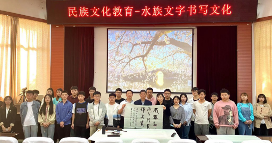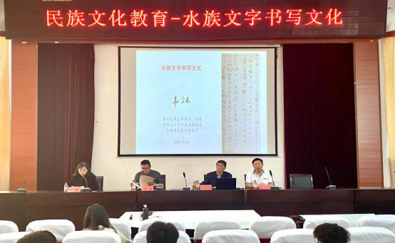 4月30日下午,由非物质文化遗产博物馆主办的“民族文化教育—水族文字书写文化”讲座在我校花溪校区15号教学楼圆形会议中心举行。本次讲座邀请到贵州民族大学硕士生导师、中国书法家协会会员韦宗林教授主讲。民族学与历史学学院党委副书记李浩,以及民族学与历史学学院、美术学院师生代表参加。