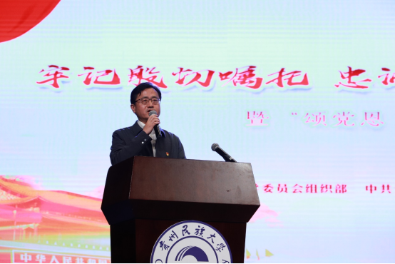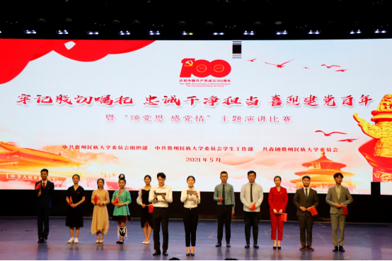 5月28日,为喜迎建党100周年,贵州民族大学在大学城校区学生活动中心大礼堂举办“牢记殷切嘱托 忠诚干净担当 喜迎建党百年”暨“颂党恩 感党情”主题演讲比赛总决赛。省委党史学习教育第十三巡回指导组副组长、省扶贫开发办公室二级巡视员程遥,巡回指导组成员、省社会科学院传媒与舆情研究所宋璨羽等领导莅临我校指导。校党委书记褚光荣,校党委副书记张鹏程、杨声国,校党委委员、副校长周杰、黄其松,校党委委员、组织部部长奉振,校党委委员、宣传部、统战部部长任洁出席。