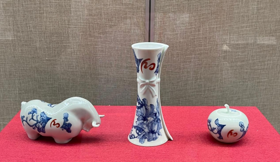 “作为一名共产党员,作为民大人,在建党100周年之际,能够作为中国工艺美术大师代表来到嘉兴,出席此次主题展并捐赠陶瓷作品,是我的荣幸。”曾瑾教授介绍,《奋进·求索·筑梦》作品为庆祝建党100周年而创作,以青花陶瓷牛、卷轴和果实三种造型呈现,牛寓意“奋进”,卷轴寓意“求索”,果实造型以及果实上放飞的白鸽图案来表现“筑梦”,以此献礼中国共产党成立100周年。