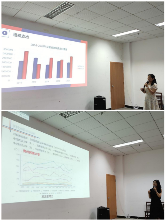 图书馆参考咨询部副主任徐嫄作《图书馆学科分析与服务工作汇报》,她以我校法学学科为例,对标国内高校,从期刊论文发文量、核心期刊发文量、发文学者及研究热点等方面进行了学科分析,结合图书馆学科资源及学科服务项目进行了推介。