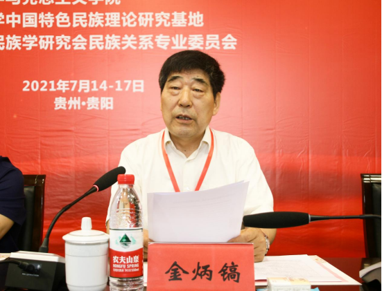 中央民族大学资深教授金炳镐作主旨演发言。他就习近平总书记在建党100周年庆祝大会上的讲话中总结的“中国共产党为什么能?中国特色社会主义为什么好?最根本的原因是马克思主义行”以及中华人民从站起来、富起来到强起来的伟大飞跃,突出了“铸牢中华民族共同体意识”的研讨会主题,强调应进一步进行马克思主义民族理论研究。他表示,中国共产党在这100年不断探索马克思主义民族理论中国化,实现了民族解放与团结,建立了中华人民共和国,并创立了中国特色社会主义体系,实现全面小康,根据这100年的经验,我们要继续认真的研究民族理论与政策。他指出,要实现新时代中华民族伟大复兴就必须铸牢中华民族共同体意识,要清晰认识到“铸牢中华民族共同体意识”是历史发展的必然。希望围绕“铸牢中华民族共同体意识”这一主题开展充分研讨,并预祝研讨会取得圆满成功。