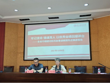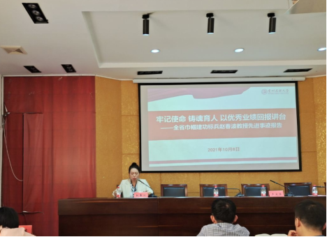 在先进事迹报告会阶段,2020年度贵州省巾帼建功标兵、马克思主义学院赵春波教授作《牢记使命 铸魂育人 以优秀业绩回报讲台——全省巾帼建功标兵赵春波教授先进事迹报告》主题宣讲。赵春波教授围绕个人的成长故事,梳理自己的从教经历,分享教书育人的成功经验,向老师们发出要时刻牢记初心使命,为党育人、为国育才的倡议。