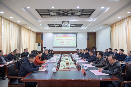 调研座谈会上,许俊松代表花溪区介绍区经济社会发展情况,介绍中共贵阳市花溪区第十二次代表大会确立的发展方向、发展目标、发展规划等。许俊松表示,花溪区取得的成绩来之不易,其中包含着民大对花溪发展的关心和支持。感谢民大对花溪区经济社会事业的发展、文化旅游的建设、社会治理的帮助提供大力支持。花溪区委将一如既往大力支持学校的各项发展,把民大花溪校区周边环境治理、毕业生就业需求等学校“急难愁盼”事作为党史学习教育“我为群众办实事”的具体行动,统筹谋划,协调各方力量,为民大师生创造安全稳定和谐校园环境。希望民大持续加强与花溪区党委政府及属地街道的联动,积极支持、配合地方管理、建设工作,花溪区各级各部门也将高标准、严要求、高质量做好对民大的服务,支持民大的建设发展,持续强化联动合作,推进双方实现共建、共治、共荣、共享。