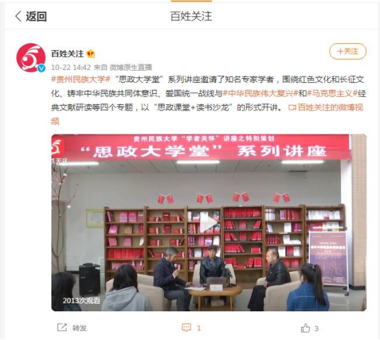 讲座在贵州广播电视台《百姓关注》栏目“微兔gogo”APP、微博、新浪、头条等新媒体平台同步直播,全网总计收听量5000+,反响良好。