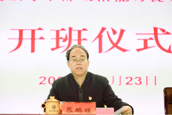 张鹏程在开班仪式上致辞。他指出,干部教育培训是干部队伍建设的先导性、基础性、战略性工程。培训的根本目标是贯彻落实习近平总书记对干部教育培训工作的要求,是结合学校第二次党代会任务落实和高质量发展实际。全面覆盖领导干部七种能力的培训,切实提高领导干部强化问题导向,解决实际问题,破解发展难题的能力,为学校“十四五”期间高质量发展提供坚强的组织保障。