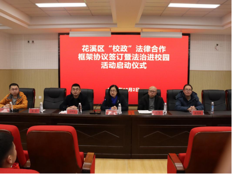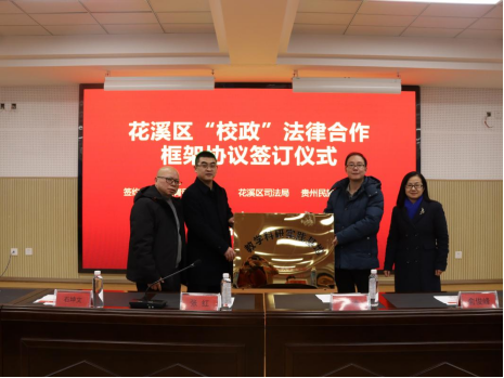贵州民族大学法学院党委书记张红、副院长(主持工作)俞俊峰,花溪区司法局及花溪区团委主要负责同志就三方合作事宜致辞,并签订了框架协议,进行了教学科研实践基地授牌。