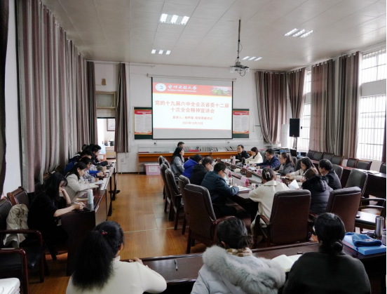 为深入学习宣传贯彻党的十九届六中全会和省委十二届十次全会精神,12月15日,校党委副书记杨声国在花溪校区为分管联系的部门、学院教职工作党的十九届六中全会和省委十二届十次全会精神宣讲。校党委委员,宣传部、统战部部长任洁主持宣讲会。宣传部、工会、档案馆全体教职工,文学院、法学院全体教职工及学生代表参加学习。