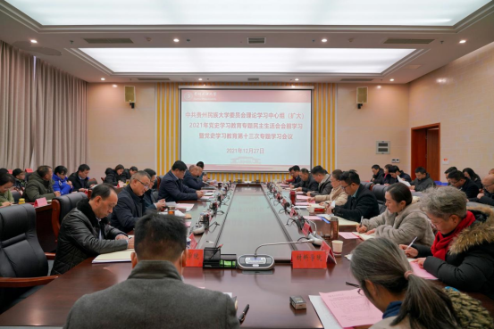 12月27日,贵州民族大学党委理论学习中心组(扩大)2021年党史学习教育专题民主生活会会前学习暨党史学习教育第十三次专题学习会议在大学城校区行政楼第七会议室召开。校党委书记褚光荣主持并讲话。校领导张鹏程、杨声国、熊元、周杰、吴嶷晖、任达森、黄其松及校党委委员奉振、任洁出席会议。