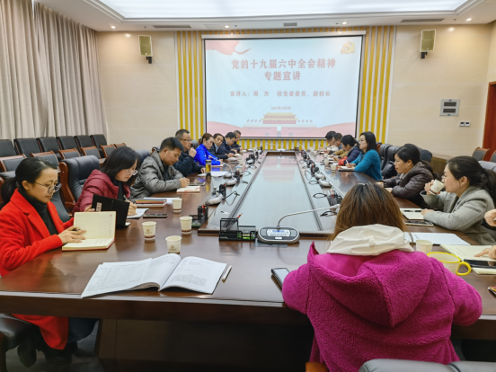 12月9日,校党委委员、副校长周杰在大学城校区第七会议室为所在支部全体党员及人事处(教师工作部)群众代表作党的十九届六中全会精神专题宣讲。