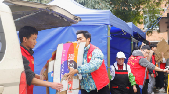 志愿者帮助食堂工作人员搬运货物