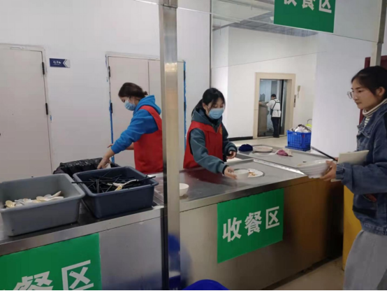 志愿者在食堂帮助收餐