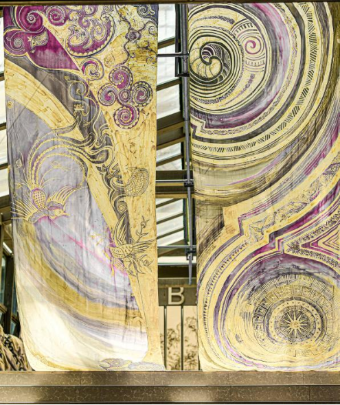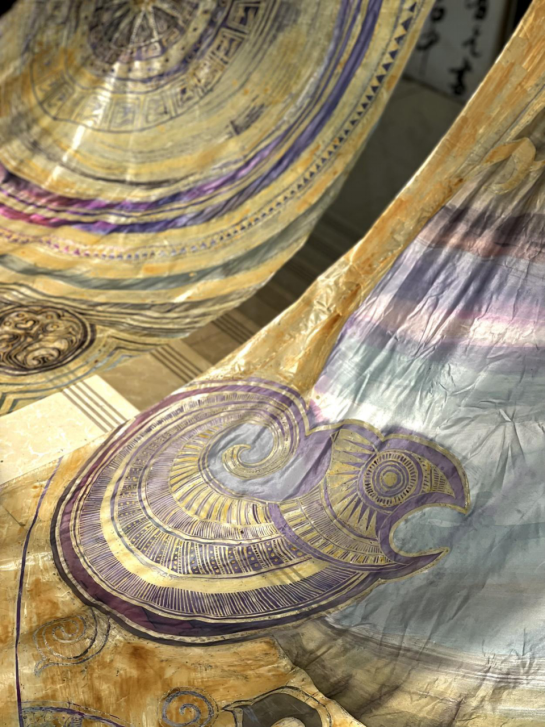 《和光共荣》寓意和民族之光,享共同繁荣,在贵州少数民族纹样中汲取各族各地具有代表性的装饰纹样作为创作组成元素,在融合传统蜡染、蜡画、刺绣等多种民间工艺创作的基础上,运用现代设计及传统植物染色,和谐雅致、细腻丰富。