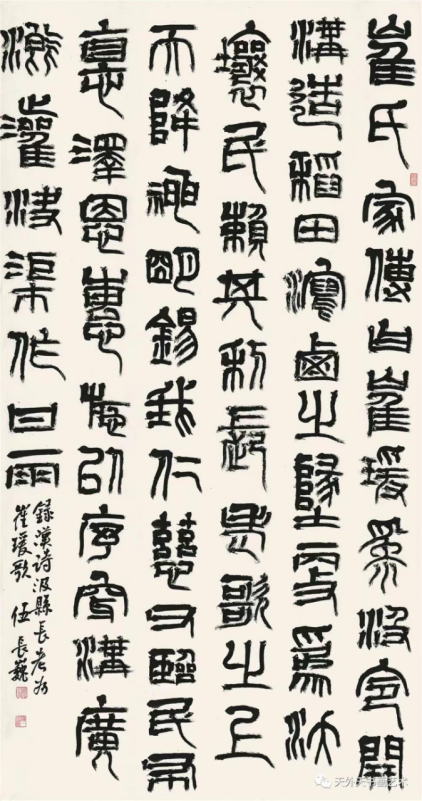 《汲县长老为崔瑗歌》用大篆和摩崖书体中惯用的裹锋绞转笔法来表现作品线质古朴苍茫和浓厚的金石味,但没有拘泥于唐宋篆及清篆,而是另辟蹊径,在《祀三公山碑》等汉篆体系碑帖中广泛涉猎,从中汲取营养,在形式上以整六尺白纸、满六行章法进行创作,白纸黑字红印使作品回归本真,表现出立意不俗、气息高古的特点。
