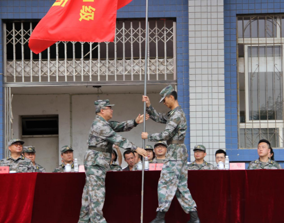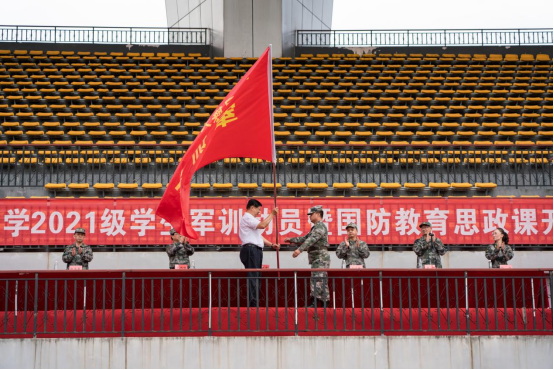 校党委副书记、校长、军训师师长王林为花溪校区2021级军训师授师旗