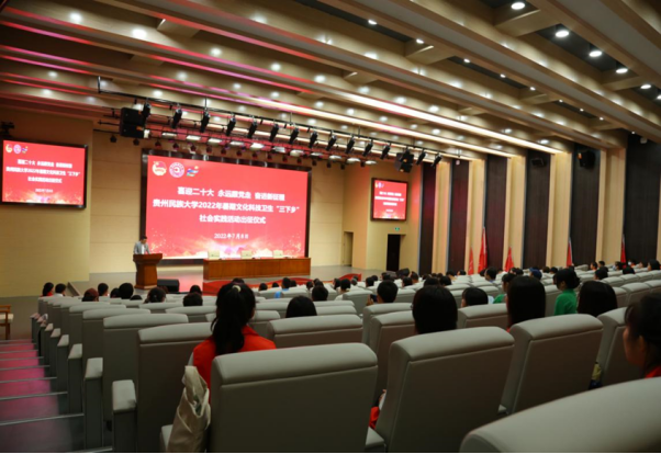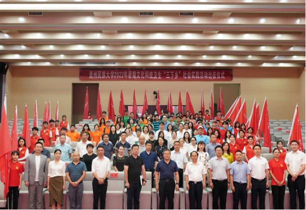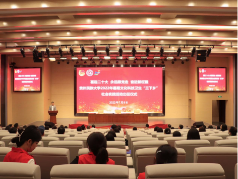7月8日下午,贵州民族大学2022年暑期文化科技卫生“三下乡”社会实践活动出征仪式在大学城校区图书馆报告厅举行。校党委副书记、校长王林,校党委副书记张鹏程,校党委委员、组织部部长奉振出席。党办、校办、组织部、宣传部、学工部、研工部、教务处、双创中心等部门负责人,各学院党委书记,各学院团委负责人,“扬帆计划”实习学生代表,社会实践队代表,个人“返家乡”代表参加仪式。校团委副书记王布云主持本次会议。