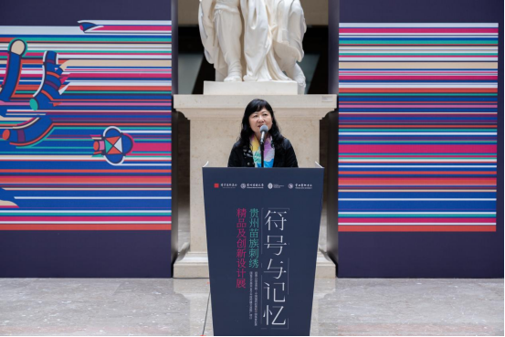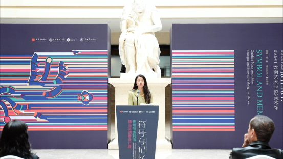 项目负责人、贵州民族大学美术学院副教授杜怡蒙介绍项目情况。她谈到,《符号与记忆——贵州苗族刺绣精品及创新设计展》的初衷是把项目展览当作一个完整的“文化事件”进行策划与研究。希望通过项目展览的交流与推广,能够种下一粒种子,让贵州苗族刺绣绽放出新的生命力。