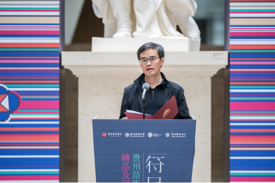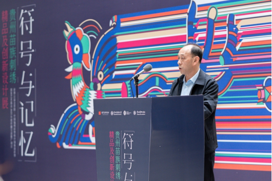 项目协办方、云南艺术学院副院长陈松致辞。他表示,展览整合贵州地域资源优势,展现了贵州苗族刺绣的“前世与今生”,具有先锋性、拓展性及时代性。是共建城市群文化合作发展平台,推动公共文化资源共享的有效实践。不仅促进了地域之间的文化艺术交流与合作,同时也站在新的时代背景和文化格局中,秉承传统、守正创新的发展之路。