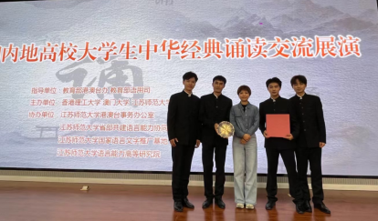10月14日,由教育部港澳台办、教育部语言文字应用管理司指导,江苏师范大学、香港理工大学、澳门大学联合举办的“2022年港澳和内地高校大学生中华经典诵读交流展演”活动在江苏徐州举行。我校传媒学院2022级播音与主持艺术1班蒙志豪、王慧豪、秦博、曾文博四名同学组队参演,以作品《少年中国说》获最佳诵读作品奖。