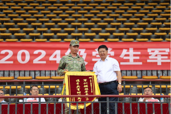 校党委书记褚光荣代表学校为承训单位中国人民解放军95580部队赠送锦旗。校党委委员、组织部部长、军训师副政委奉振宣读《贵州民族大学2024级学生军训嘉奖令》,校领导为获得“优秀连队”“优秀教官”“优秀教导员”“优秀战士”荣誉称号的集体和个人颁奖。