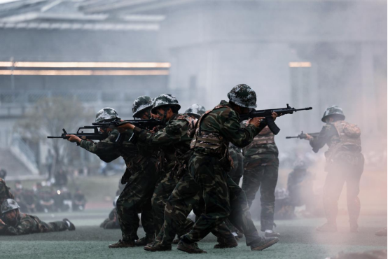 军训成果汇演在雄壮的国歌声中拉开帷幕。队列整齐、声音洪亮,英姿飒爽。党旗方阵、国旗方阵、师旗及持枪方阵、参训教师方阵、各学院代表方阵精神抖擞、步伐铿锵有力,喊着嘹亮的口号走过主席台接受检阅。参训学生军姿挺拔,展现了昂扬的斗志和蓬勃的气势。擒敌术、刺杀操、匕首操、应急棍、战术等成果汇报赢得现场观众阵阵掌声和欢呼声。经过多天的严格训练,同学们军容整洁、姿态端正,队列动作、表演动作干净利落,高标准完成了军训的各项内容,展现出了贵州民族大学学子风采。