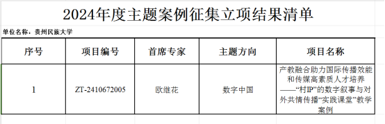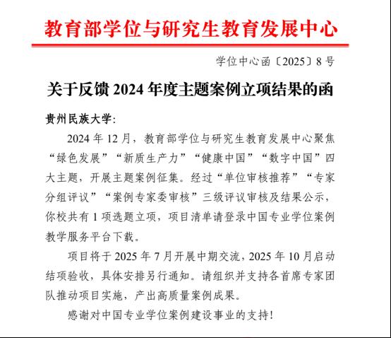 近日,贵州民族大学成功获批教育部2024年度主题案例建设项目。教育部主题案例建设项目由教育部学位与研究生教育发展中心组织,围绕“绿色发展”“新质生产力”“健康中国”“数字中国”四大主题,旨在开发具有时代性、价值性、高学理含量的专业学位研究生案例资源,为建构中国自主知识体系提供案例视角。