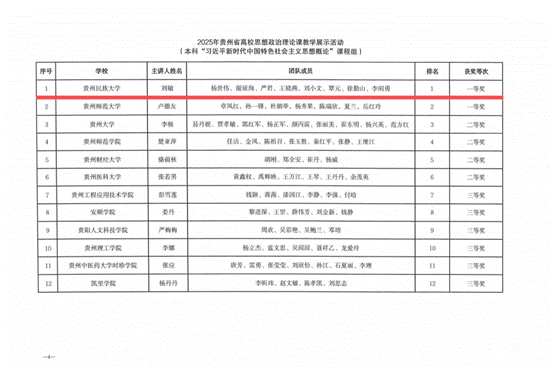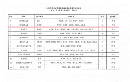 此外,近期省教育厅下发了关于第四届全国高校思想政治理论课教学展示活动贵州省初赛结果的通报,我校参赛教师团队再创佳绩,7个教师团队满额参赛、全部获奖,2个团队晋级国赛,创省赛历史最好成绩,其中一等奖2项(刘敏领衔的本科“习近平新时代中国特色社会主义思想概论”课程团队和孙雪雷领衔的本科“马克思主义基本原理”课程团队晋级国赛),二等奖2项(许文英领衔的本科“毛泽东思想和中国特色社会主义理论体系概论”课程团队、杨荣华领衔的研究生思政课课程团队),三等奖3项(刘红敏领衔的本科“思想道德与法治”课程团队、何丽芝老师领衔的本科“中国近现代史纲要”课程团队、肖军老师领衔的本科“形势与政策”课程团队)。
