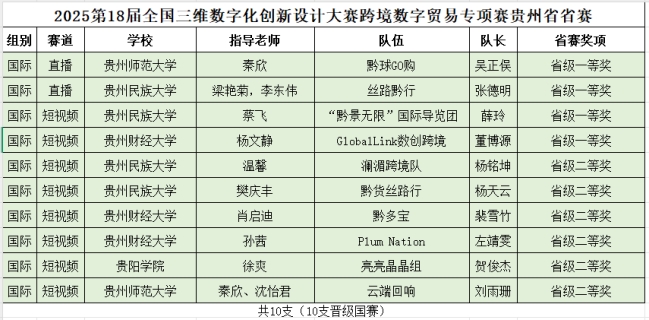 近日,由全国三维数字化创新设计大赛组委会、国家制造业信息化培训中心、全国三维数字化技术与教育培训联盟、北京光华设计发展基金会联合主办的2025第18届全国三维数字化创新设计大赛跨境数字贸易专项赛贵州省省赛在贵州财经大学圆满落幕。我校国际教育学院(东盟人文学院)学子斩获国际组直播模拟带货赛道一等奖1项,短视频模拟带货赛道一等奖1项、二等奖2项。此次省赛共10支队伍晋级国赛,我校4支参赛队伍全部晋级,充分展现了民大学子的专业素养与创新能力。