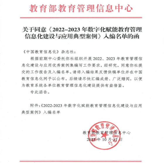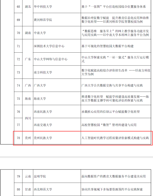 近日,教育部教育管理信息中心公布了2022-2023年数字化赋能教育管理信息化建设与应用典型案例入编名单,贵州民族大学新时代教育评价改革试点团队报送的案例“人工智能时代教学过程质量评价新模式构建与实践”成功入选。本次入选是教育部对学校在教育信息化建设与应用方面所作出的努力和成果的肯定。